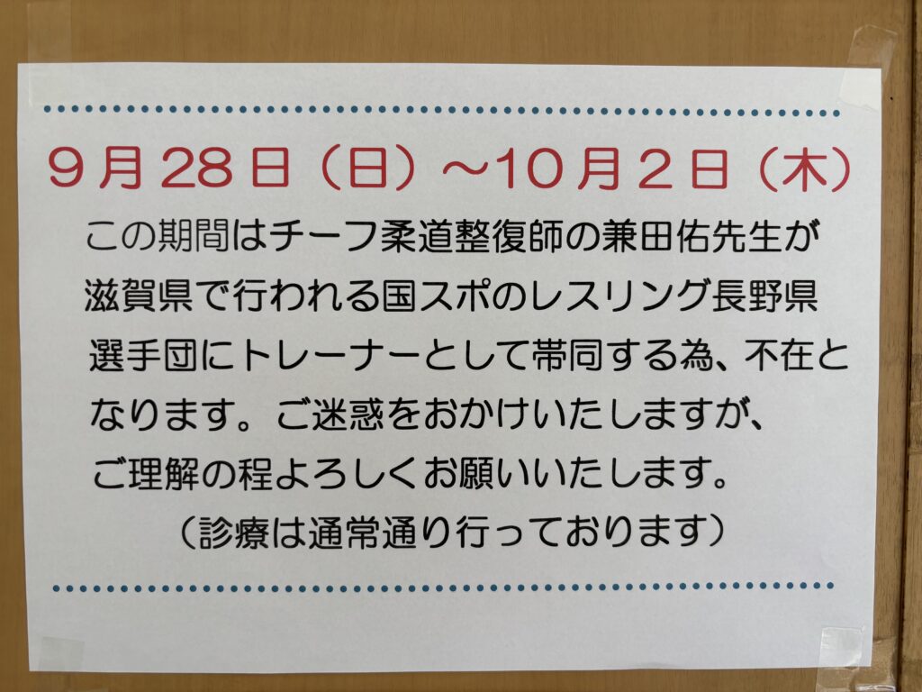 9月28日(日)~10月2日(木)について 2025年9月24日 最終更新日時 : 2025年9月24日 内山整骨院 当院チーフ柔道整復師の兼田先生が、国スポに参加するレスリングの長野県選手団にトレーナーとして帯同いたします。上記の期間は不在となりますが、診療は通常通り行いますので、ご理解の程よろしくお願い致します。